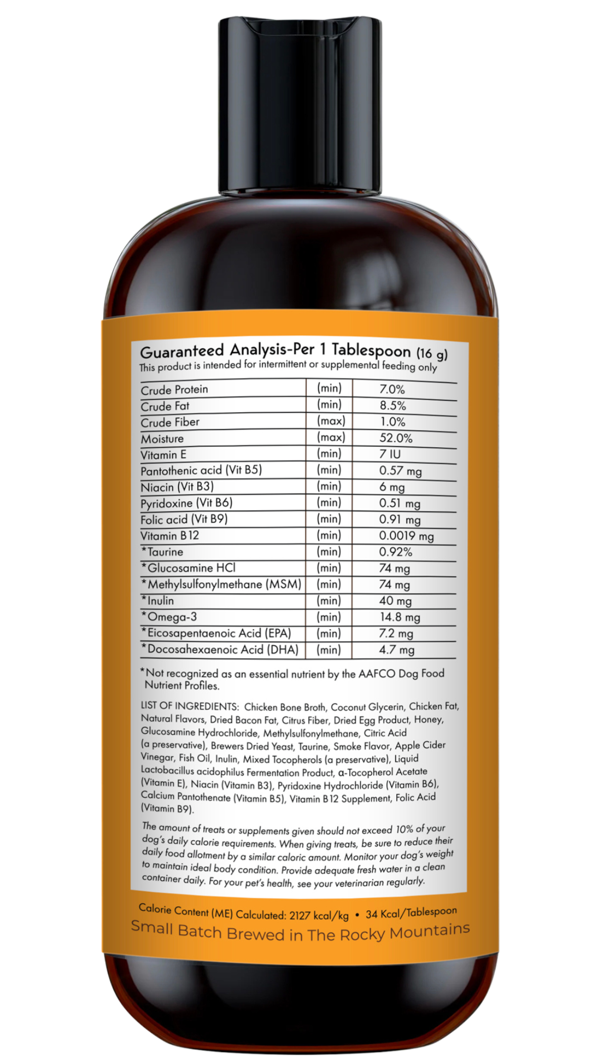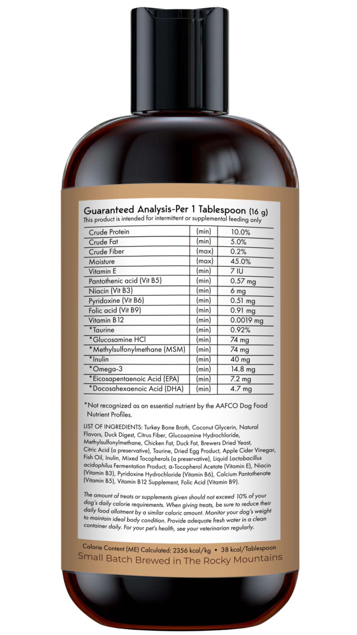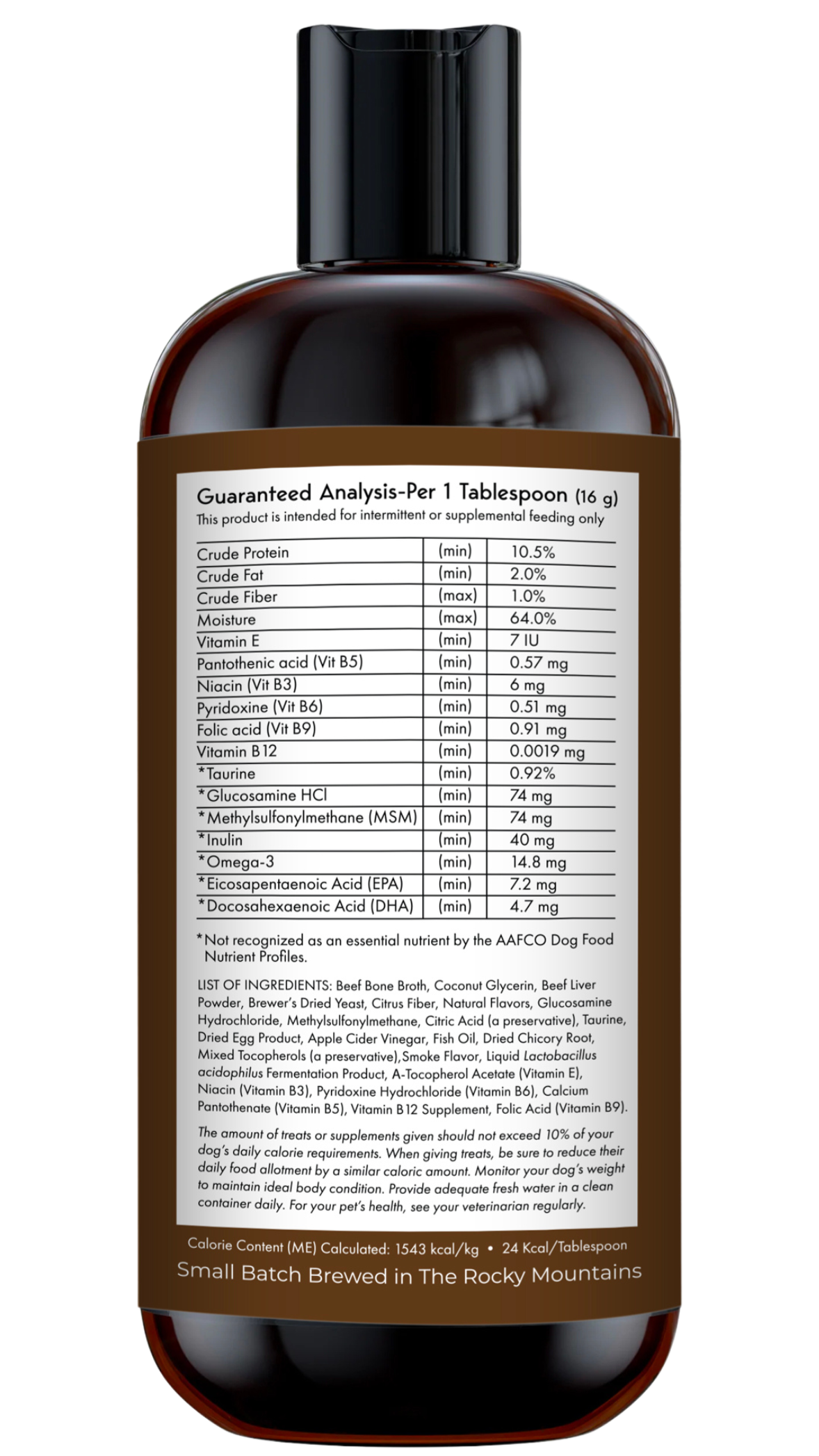 - Brewer's yeast is a natural source of probiotics that can help promote a healthy gut microbiome, while chicken bone broth provides collagen, gelatin, and other nutrients that can help improve gut lining health. Chicory root is a prebiotic that can help stimulate the growth of beneficial gut bacteria, and citrus fiber can help support healthy bowel movements. Tynagen™ is an enzyme blend that can help improve digestion and nutrient absorption, and apple cider vinegar can help regulate pH levels in the digestive tract, promote healthy digestion, and prevent the overgrowth of harmful bacteria. By providing these key ingredients in one supplement, the digestive blend can help reduce digestive issues such as bloating, diarrhea, and constipation, improve nutrient absorption, and promote overall digestive health. This can result in better nutrient utilization, improved energy levels, and better overall health and well-being for dogs.